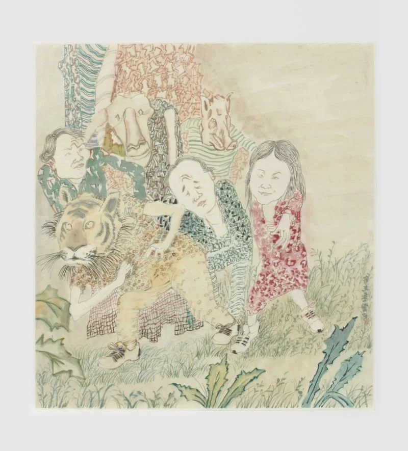 Yun-Fei Ji is a Beijing born, New York based artist whose satirical works critique prevailing global power structures to consider the forced migration and willing immigration of people around the world and their resulting experiences, which are exclusionary and predicated on bias. In Ji’s ink and watercolor painting Nativists and the Immigrants, the artist presents this rising tide of intolerance and the predicament faced by anyone not representative of the dominant culture. A muted color palette combined with a mixture of humans and anthropomorphic animal forms appears at first glance light-hearted, even humorous. Surrounded by three women, a tiger-headed figure dominates the foreground, directly behind them looms an ox and a pig, both with human bodies. There is much to consider in this scene, yet my eye is repeatedly drawn to the crouching tiger figure. The magnetism of this tiger-figure almost explains how people can be unwittingly led astray by the dynamism of leaders, cultural movements, and collective opinions. But here, Ji’s figure alludes to the Confucian parable of a tyrannical government being worse than death as a tiger’s lunch. In light of this symbolism, Ji references the social ills and struggles immigrants and people of color face around the world. The artist illuminates the complex and precarious balance between assimilating for survival, navigating the unfamiliar, prevailing against societal biases, and preserving one’s individual sense of cultural identity. This last factor is especially poignant because nativists and immigrants have something in common: they are all struggling to retain their cultural identities.