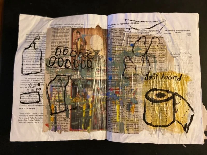 covid diary, 2020, artist book, collaged newspaper and gouache, 11 x 17 inches (don’t hoard)
