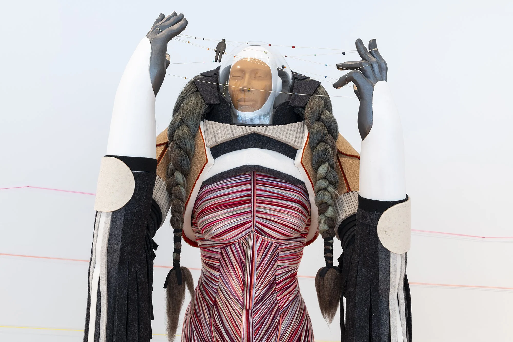 Three anthropomorphic travelers, with Hidatsa titles of awáasha (bean), gagúwi (squash), góoxaadi (corn), stand dressed in suits designed for cosmic voyage. Constructed with repurposed textile and fibers, the tactile suits, each wonderfully varied in color and detail, suggest a self-protective purpose for their nomadic wearer. Natural cork panels surround the neck and shoulders of each traveler, resembling a soft exoskeleton. Multi-colored thread rhythmically wraps around their upper bodies like ligaments, articulating their torsos and upper legs. This pliable barrier of intricately positioned thread comprises the interstitial fabric between inner and outer space. To protect their breath, the travelers, with faces carved of clay, wear clear, translucent helmets. Long braided hair falls from their helmets echoing the long, thick strips of felt dangling from their elbows. With closed eyes, the travelers hold their gloved hands—outstretched and deliberate—in front of their faces. Delicate strings are interwoven between their fingers, some containing a suspended figurine caught between the web. Unlike the sleek, streamlined cyberscape of popular culture sci-fi films like Tron (1982) or Blade Runner (1982), these space travelers adorn themselves in regalia of reused clay, fiber, cork, and string. Using these craft materials to upend visual expectations of technological advancement, Luger seeks to expand definitions of technology beyond a progressivist narrative rooted in computing mechanisms or algorithms. The craftsmanship evident in Luger’s process of making, including material collection and recovery, reveal traces of the handmade as archival marks of human experience and intervention; like time machines, the “sovereign suits” channel traditions of ancestral craft and embodied knowledge.