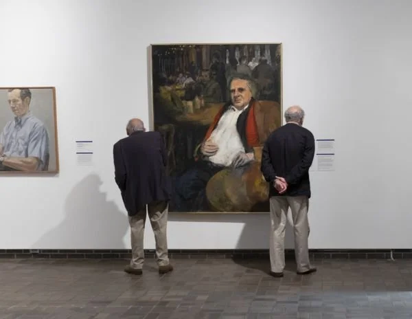 Installation view from “Irving Sandler: Points of View” at the Neuberger Museum of Art, featuring an archival photo of Irving and Lucy Sandler with Roy R. Neuberger, founding patron of the Neuberger. Photograph by Ed Cody.